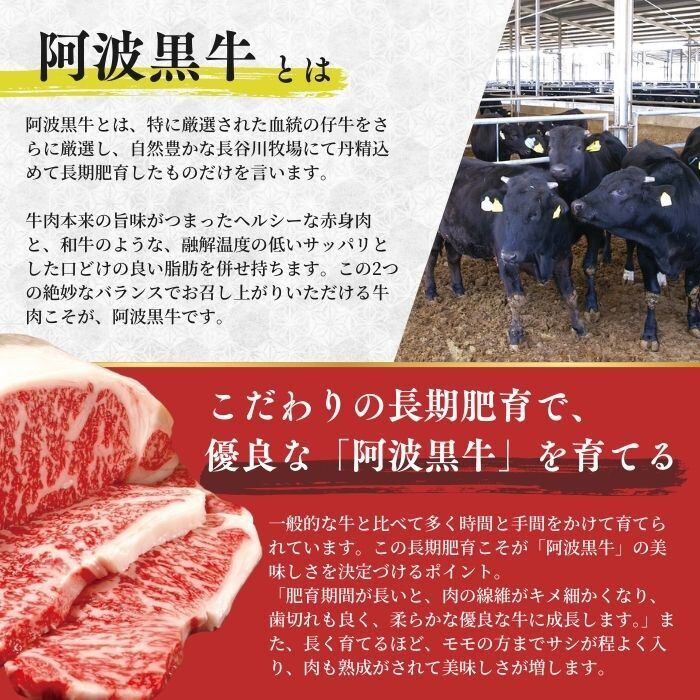 「阿波黒牛」は、黒毛和牛とホルスタインの交雑種(F1)。脂のさっぱり感と赤身肉のコクを兼ね備えた“いいとこ取り”のブランド牛です。脂肪は軽やかで、肉質は柔らかくきめ細やか。特産の鳴門金時を使用した特製飼料と吉野川の伏流水で大切に育てられています。