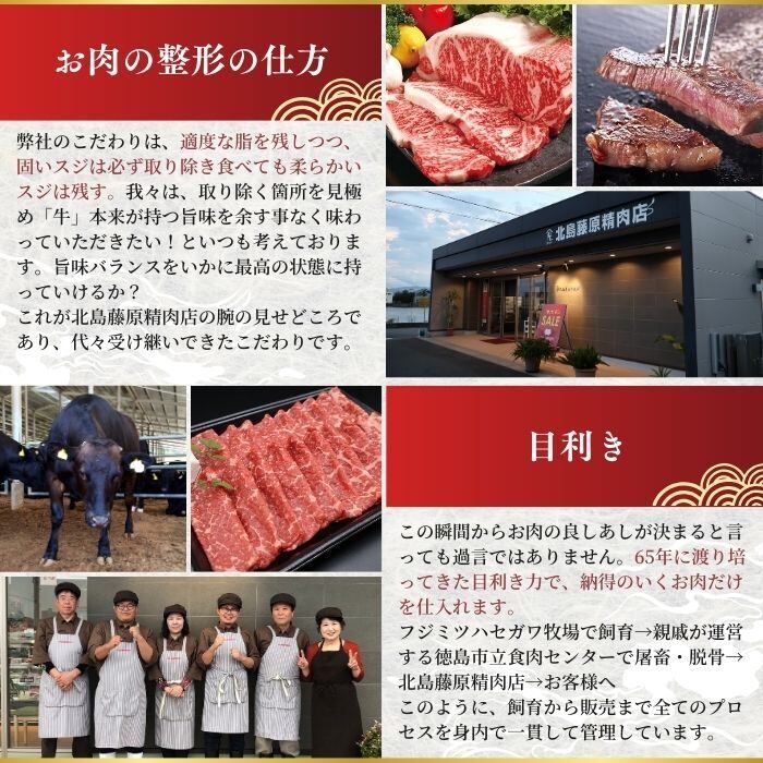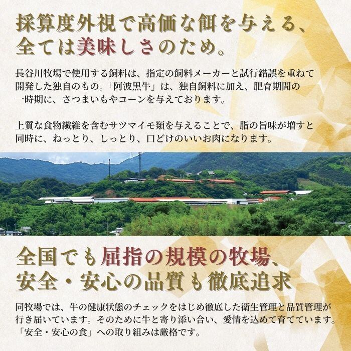 「阿波黒牛」は、黒毛和牛の脂のまろやかさと赤身肉の力強い旨味を兼ね備えた、まさに“いいとこ取り”のブランド牛。脂はさっぱりとしていて、肉質はきめ細かく柔らか。さらに、オレイン酸や不飽和脂肪酸(オメガ3)を豊富に含む健康的な美味しさが魅力です。鳴門金時を使った特製飼料と、吉野川の伏流水で育てられたことで、他にはない独特の味わいを実現しています。