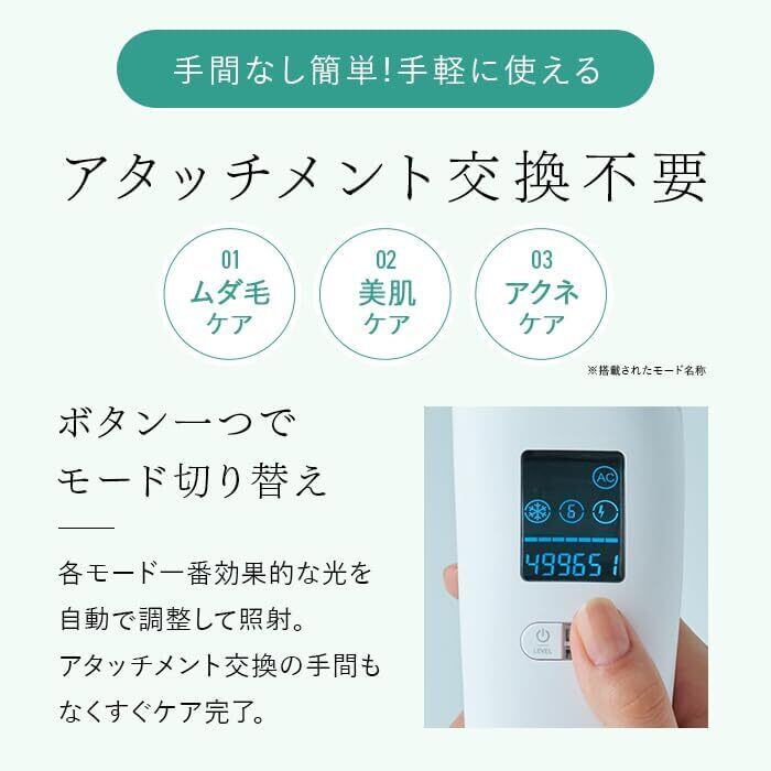 「Wアイスプロテクション」や国内初の独自除菌機能「オートクリーンシステム」を搭載し、「全身ムダ毛ケア」を叶え、※「痛さ・熱さ」を抑え、「いつでも、清潔」に使えます。IPL光テクノロジーによるムダ毛ケアモードの他、美肌ケアモードとアクネケアモードの選べる3つのモードで、より美しく健やかな肌へと導きます。